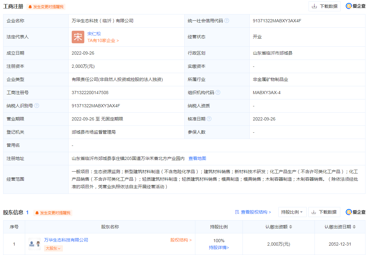 天眼查App显示,万华生态科技(临沂)有限公司注册成立2022年9月26日,注册资本2000万人民币,法定代表人宋仁松。唯一股东为万华生态科技有限公司(以下简称“万华科技”)。经营范围包括生态资源监测;新型建筑材料制造;建筑材料销售;新材料技术研发;化工产品生产;化工产品销售;轻质建筑材料制造;轻质建筑材料销售;模具制造;模具销售;木制容器制造;木制容器销售。
