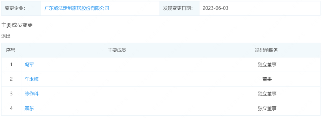 6月5日,广东威法定制家居股份有限公司近日主要成员发生变更,冯军、陈作科、聂东退出独立董事职务,车玉梅退出董事职务。