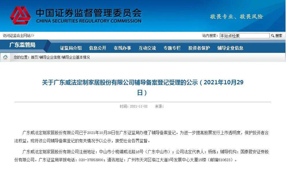 广东威法定制家居股份有限公司已于2021年10月29日在广东证监局办理了辅导备案登记,辅导机构为国泰君安证券股份有限公司。