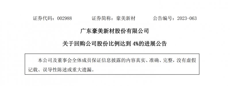 6月15日,豪美新材(SZ002988)发布关于回购公司股份比例达到4%的进展公告。