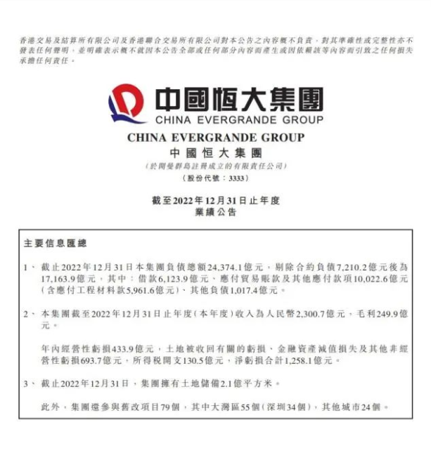 业绩报告显示,2021年和2022年,中国恒大合计净亏损8120.3亿元,是此前12年净利润的2.9倍。截至2022年末,该公司负债总额约2.44万亿元,而手中的现金及现金等价物仅有43.34亿元,已是资不抵债。