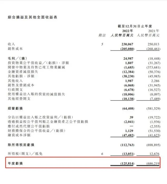 公告显示,2021年,中国恒大实现营收2500.1亿元,毛利亏损184.48亿元。年内经营性亏损为1137.5亿元,撇减发展中物业及持作出售之已完工物业、投资物业公平值亏损为4049.5亿元,土地被收回有关的亏损、金融资产减值损失及其他非经营性亏损为1802.0亿元,所得税抵免为126.8亿元,净亏损合计6862.2亿元。