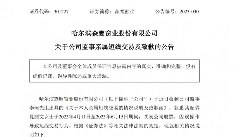 6月20日,森鹰窗业发布公告称,公司于近日收到公司监事李珂出具的《关于本人亲属短线交易的情况说明及致歉函》,获悉其配偶夏丽文于2023年4月11日至2023年6月15日期间,买卖公司股票,因误操作导致短线交易行为。