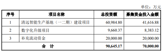 其中,清远智能生产基地(一二期)建设项目总投资6.1亿元,拟使用募集资金4.16亿元;数字化升级项目总投资9660.37万元,拟使用募集资金8383.12万元。项目建设期为3年。