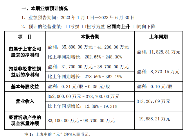 7月11日,东鹏控股发布2023年半年度业绩预告显示,公司预计实现营业收入为35.2亿元-37.37亿元,比上年同期增长12.39%-19.31%;预计归属于上市公司股东的净利润为3.58亿元-4.12亿元,同比增长202.65%-248.3%。