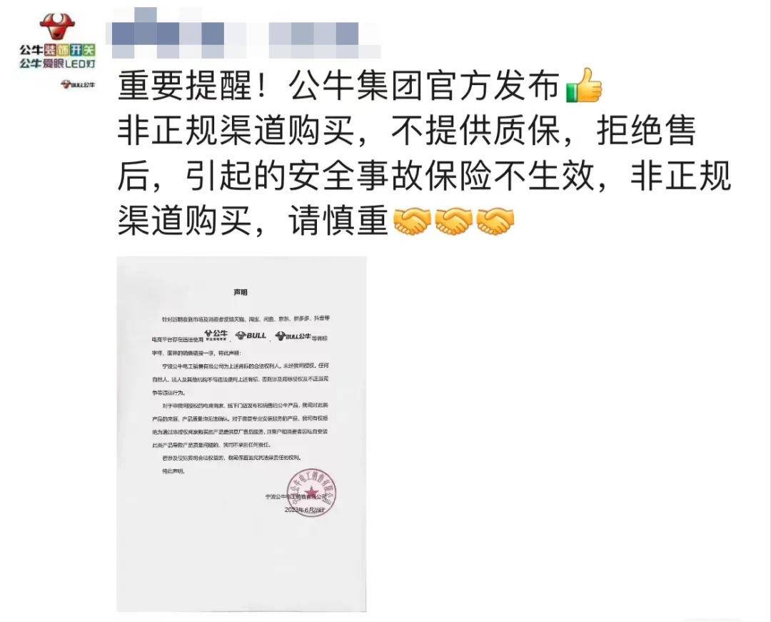 随即,公牛经销商也转发《声明》并发声:“重要提醒!公牛集团官方发布,非正规渠道购买,不提供质保,拒绝售后,引起的安全事故保险不生效,非正规渠道购买,请慎重!”资料显示,成立于1995年的公牛集团,成立于1995年的公牛电器,是国内领先的高档开关插座、转换器、家用LED灯的专业供应商,在提供优质产品和服务的同时,秉承“忠信诚和、专业专注”的发展理念,始终致力于为大众营造更安全的用电环境。