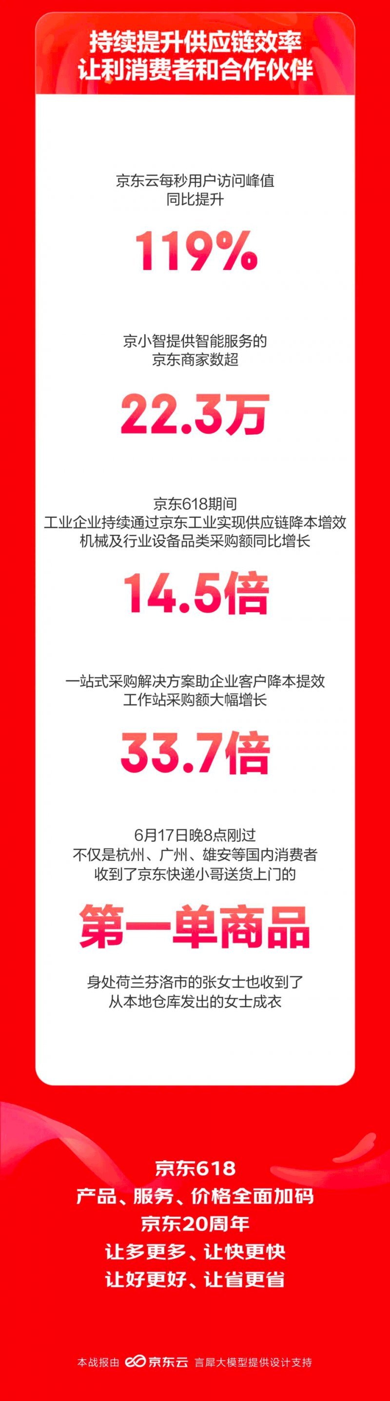 20年来,作为新型实体企业的代表,京东通过不断地提升供应链效率,为更多消费者提供超预期的购物体验,让多更多、让快更快、让好更好、让省更省。