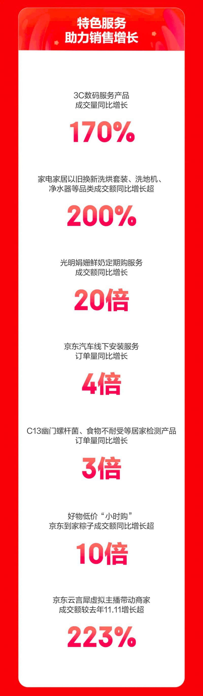 一直以来加码特色服务的京东今年继续提升服务项目所覆盖的品类、时长和力度。高潮期前10分钟,3C数码产品以旧换新成交量同比增长超3倍,家电家居以旧换新洗烘套装、灶具、洗地机、洗碗机、净水器等品类成交额同比增长超200%。