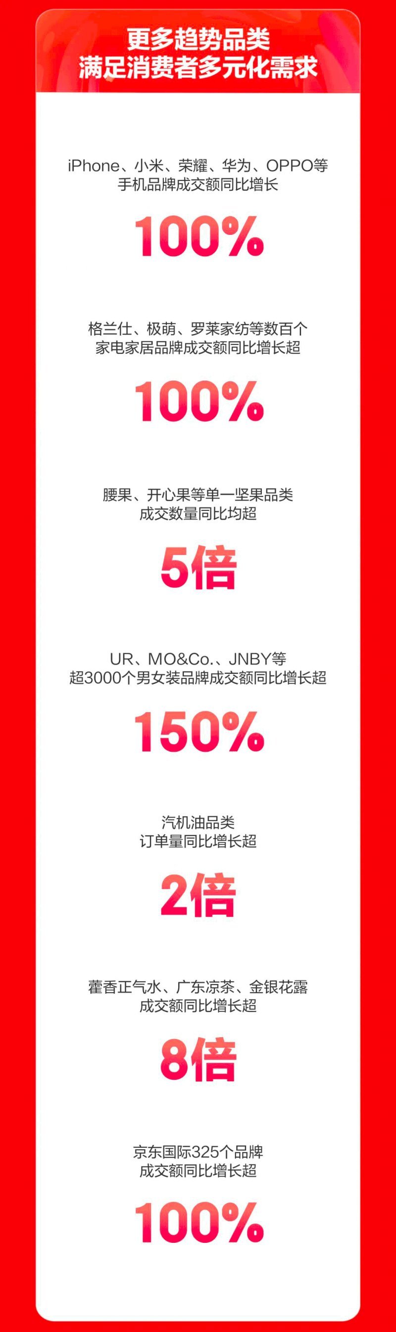 京东超市全渠道业务10分钟内成交额同比增加3.3倍,全渠道业务动销门店突破8万。babycare官方旗舰店成交额同比增长190%、英氏官方旗舰店增长215%,联合利华官方旗舰店增长260%、自由点旗舰增长5倍,嘉柏兰官方旗舰店增长40倍、金博仕官方旗舰店增长40倍,乐器品类卡瓦依品牌增长20倍。