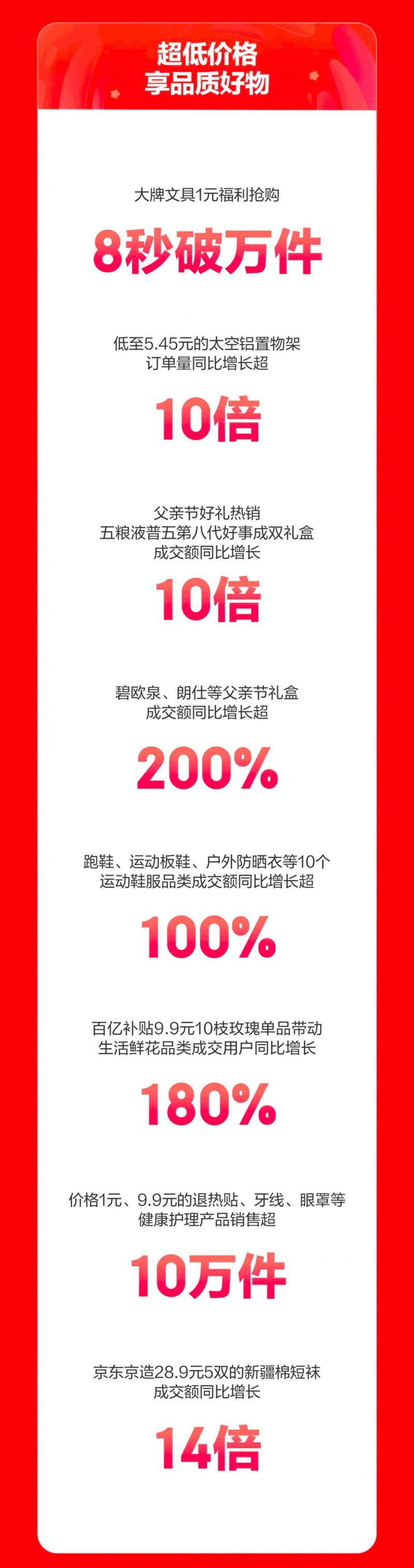 父亲节将至,很多消费者会给爸爸及时送上一份健康好礼。高潮期开场10分钟,补益类用药成交额同比超去年全天;体检服务成交额同比超 3倍,其中中老年体检套餐和男性体检套餐成交额同比超5倍。膝盖理疗仪、理疗电烤灯等理疗护具也受到用户喜爱,成交额同比增长3.8倍;人生/西洋参成交额同比增长12倍;增强免疫力的寿仙谷破壁灵芝孢子粉颗粒礼盒成交额同比增长13倍。即买即送,开场10分钟,京东药急送汤臣倍健蛋白 粉的成交额同比增长3.5倍。