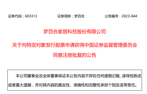 7月6日,梦百合发布公告称,近日公司收到中国证券监督管理委员会出具的《关于同意梦百合家居科技股份有限公司向特定对象发行股票注册的批复》。