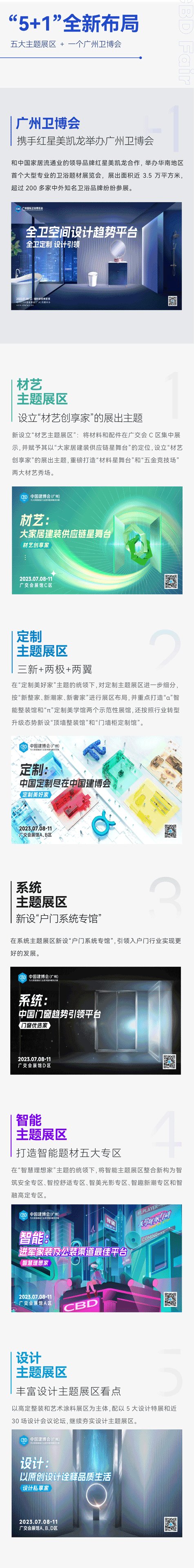 2023年,中国建博会(广州)根据行业发展特点和趋势,进一步完善了展出题材结构,开辟了一些新展区,使2023中国建博会(广州)形成了全新的“定制、系统、智能、设计、材艺”五大主题展区及一个广州卫博会的“5+1”全新布局,能更好地助力大家居建装行业实现高质量发展。