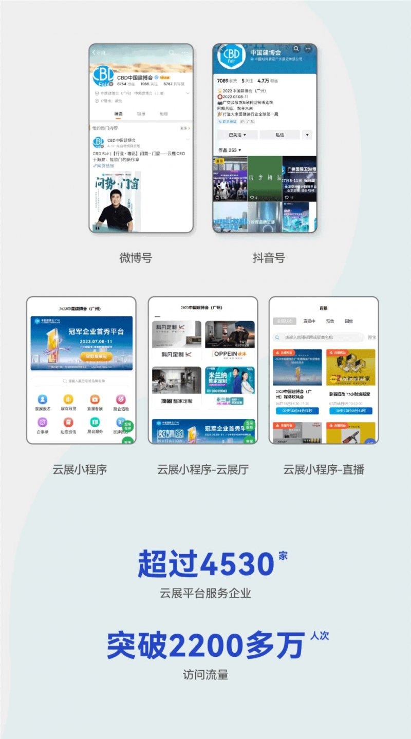 中国建博会(广州)始终以创新驱动变革,坚持赋能企业与行业发展。自2020年起,中国建博会(广州)创新开拓了线上线下融合的发展路径,打造“赋能·云展”平台,连续三年突破服务边界,成功为参展商开辟了线上营销的全新服务。“赋能·云展”平台以建博会官方小程序为引领,综合规划和协同建博会官网、微信公众号、视频号、云展厅、线上直播等渠道,协同铺设小红书、企业微信、新浪微博、抖音号、头条号、网易号、百家号、搜狐号等新媒体渠道,升级打造云展会、云直播、云洽谈和云对接等服务。