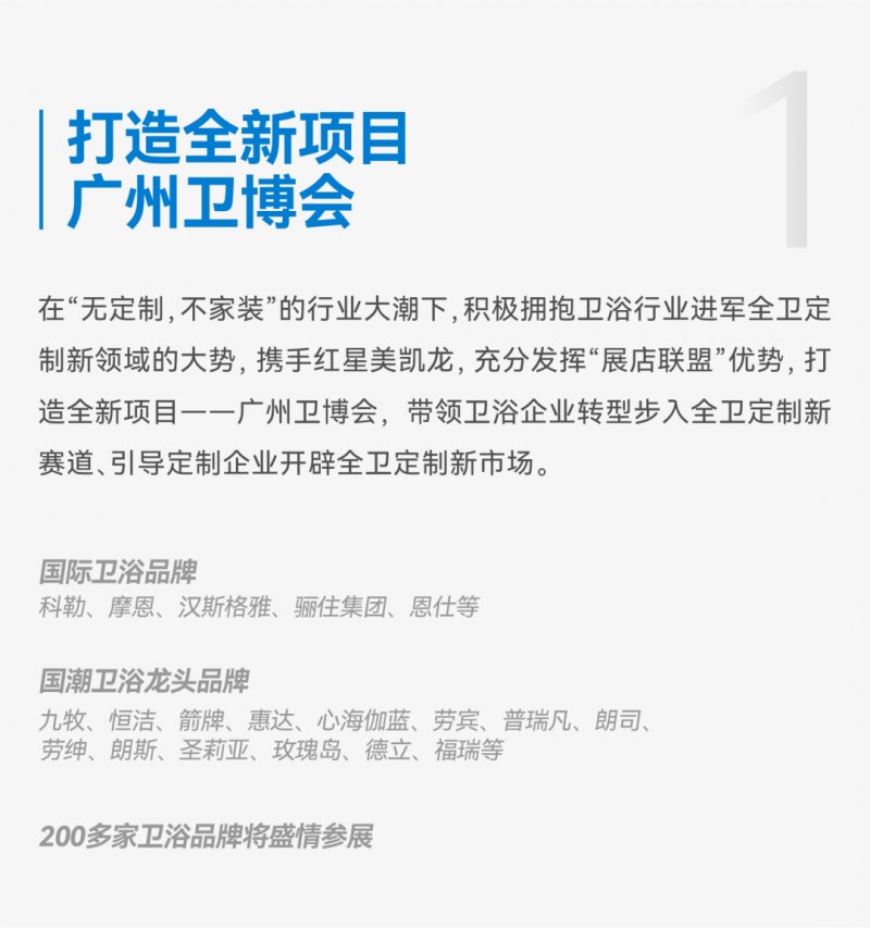 作为大家居建装行业全球第一展,中国对外贸易中心集团有限公司旗下的2023中国建博会(广州)将形成“定制、系统、智能、设计、材艺”五大主题展区及卫浴博览会的全新布局,参展企业近2000家、展览面积40万平方米,将更好地以行业“冠军企业首秀平台”“行业招商第一平台”“创新思想首发平台”和行业“设计生态圈”的优势,助力大家居建装行业实现高质量发展。