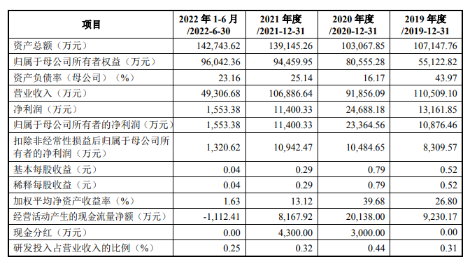 财务数据显示,公司2019年、2020年、2021年、2022年前6月营收分别为11.05亿元、9.19亿元、10.69亿元、4.93亿元;同期对应的归母净利润分别为1.09亿元、2.34亿元、1.14亿元、1553.38万元。