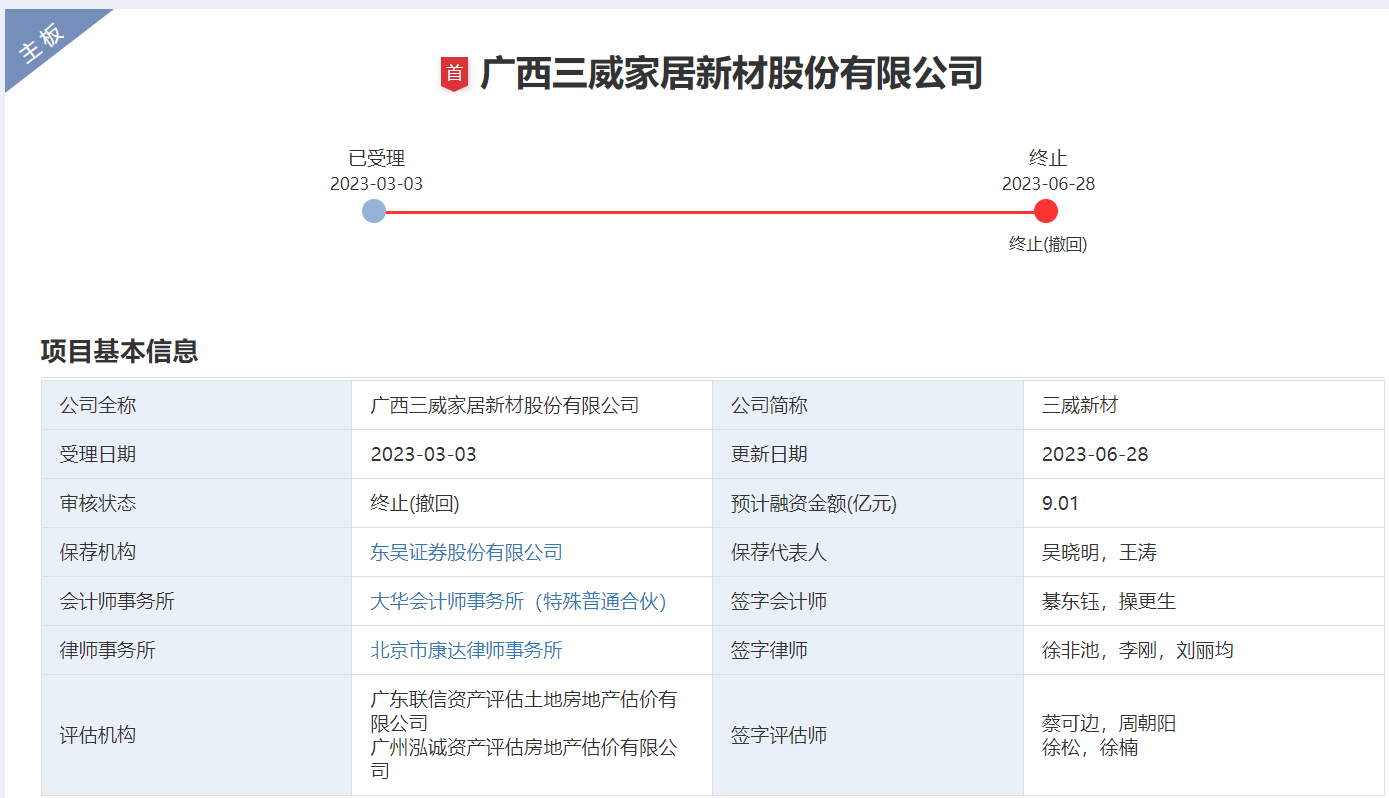 6月28日,深交所披露公告显示,6月21日,广西三威家居新材股份有限公司申请撤回发行上市申请文件。根据《深圳证券交易所股票发行上市审核规则》第六十二条,深交所决定终止对其首次公开发行股票并在主板上市的审核。