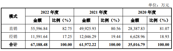 报告期内,公司采取以直销为主,经销为辅的销售模式。公司直销模式下主营业务收入分别为2.84亿元、4.99亿元、5.56亿元,占主营业务收入的比例分别为81.07%、80.56%和82.75%;经销模式下主营业务收入分别6628.96万元、1.20亿元、1.16亿元,占主营业务收入的比例分别为18.93%、19.44%和17.25%。