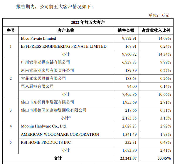 报告期内,公司前五大客户占营业收入的比例分别为31.97%、28.30%和33.45%。公司重要客户包括印度Ebco、索菲亚、韩国Moonju、北美橱柜龙头企业美国Woodmark(纳斯达克上市公司)等五金品牌商和家居生产企业。