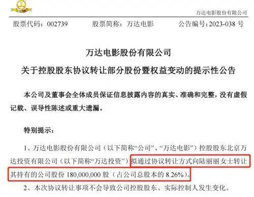 11日晚间,万达电影公告称,北京万达投资拟通过协议转让方式向东方财富实控人的妻子陆丽丽转让其持有的公司股份1.8亿股,占公司总股本的8.26%,转让价格为12.07元/股。