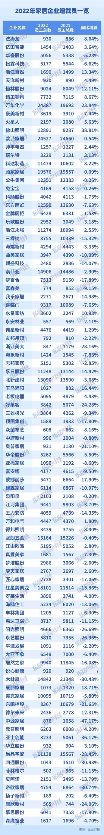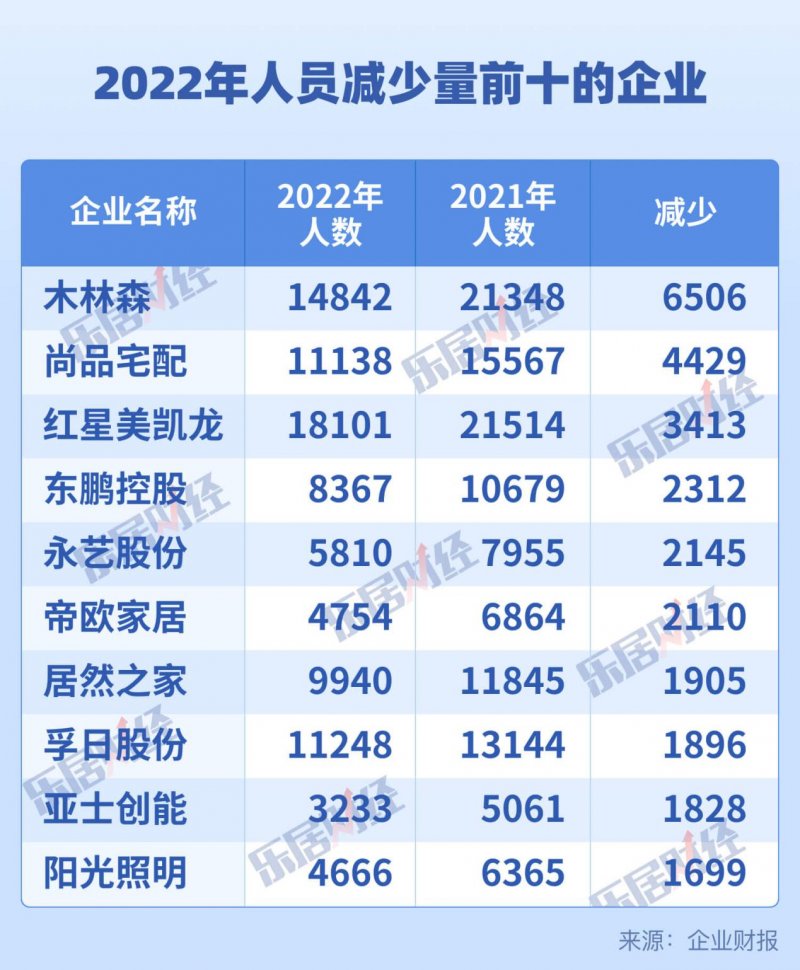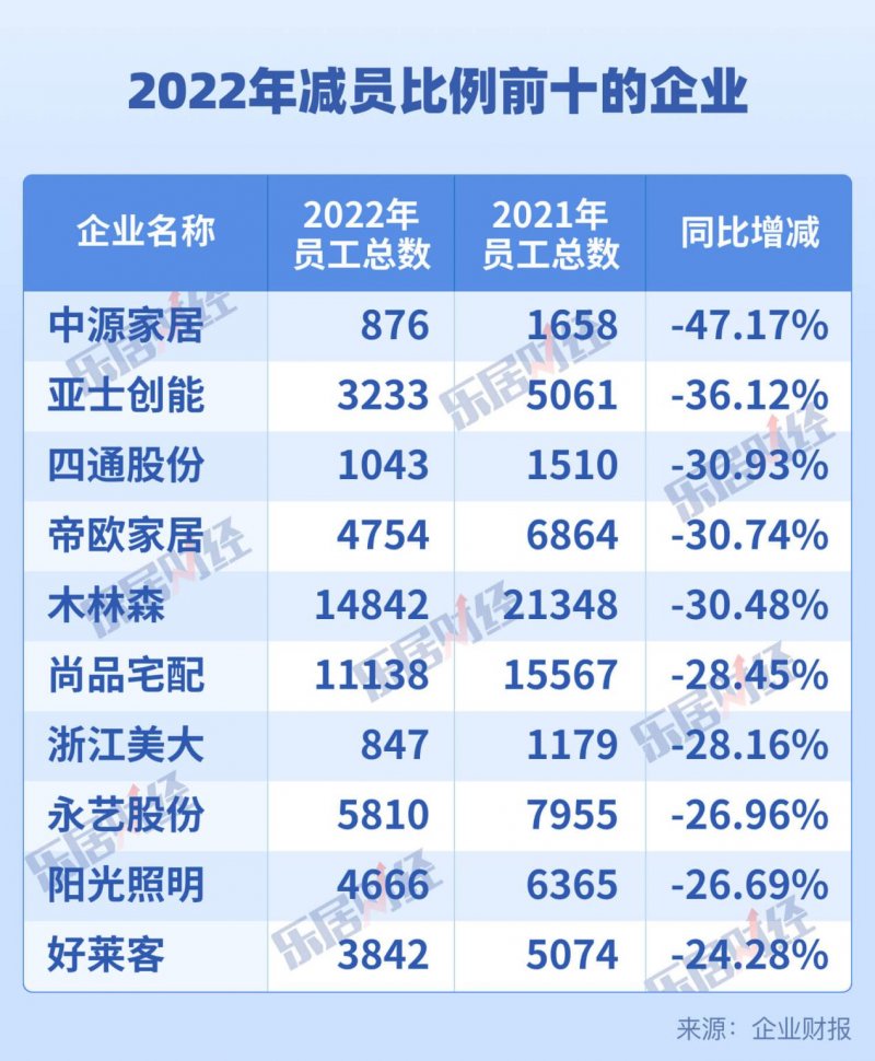 其中裁员比例最高的企业为中源家居,2022年,其员工总数量为876名,而2021年,该公司尚有1658名员工,员工总数同比减少47.17%,“裁员”近半数。