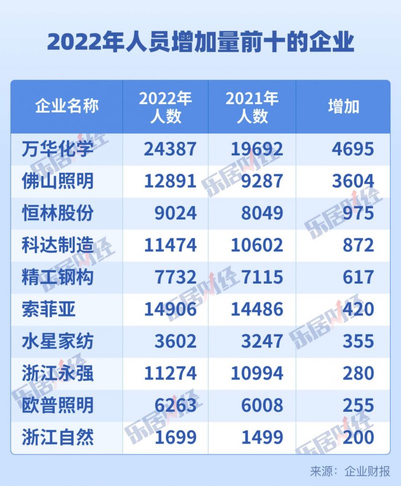 其中,木林森、尚品宅配、红星美凯龙是2022年在职员工减少最多的三家,比2021年分别减少了6506人、4429人、3413人;万华化学、佛山照明、恒林股份是2022年在职员工增加最多的三家,比2021年分别着增加了4695人、3604人、975人。