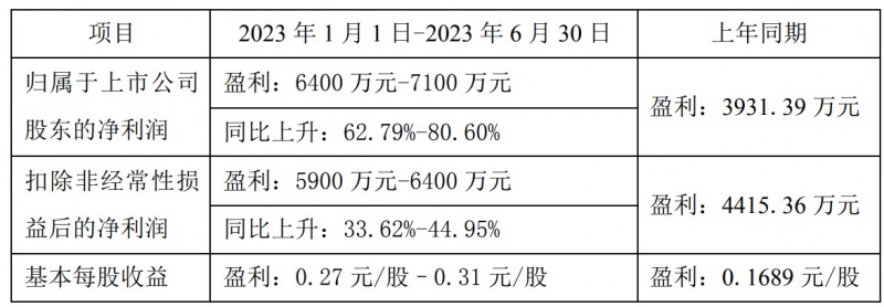 公司预计2023年上半年归属于上市公司股东的净利润盈利6400万元-7100万元,同比上升62.79%-80.6%。