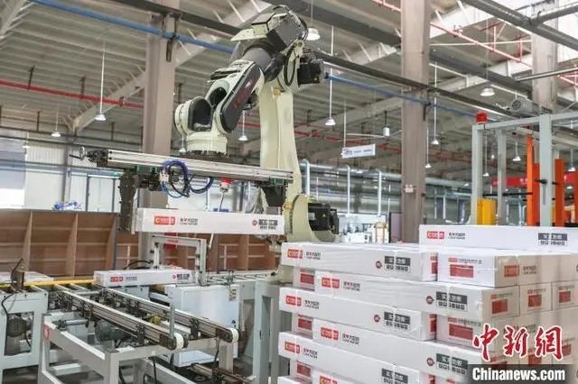 图为大自然家居高端智能智造(南康)基地,智能机器人将包装好的产品搬运码垛在一块。(资料图) 刘力鑫 摄