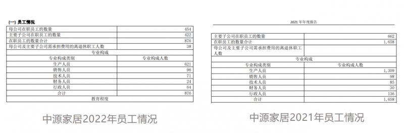 业务表现乏力依旧是重要原因,结合其2021年至2022年的营收数据,中源家居的营收和净利润均连续2年同比下滑,其中净利润则持续亏损,同比分别下滑136.75%和173.2%,亏损加大。据中源家居2020年报告披露,2020年该公司员工总数为1947人。