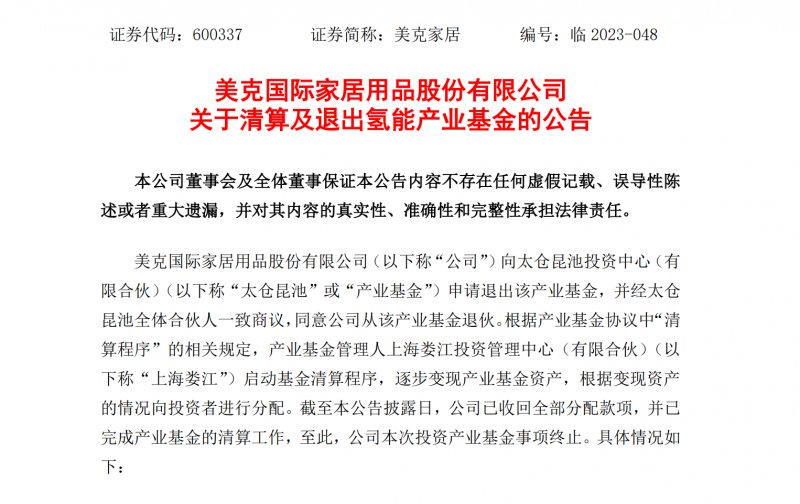 此次美克家居要退出的产业基金主要投资于氢能产业,据公开资料显示,2019年,美克家居通过了关于参与投资氢能产业基金的议案,与上海娄江投资管理中心(有限合伙)(以下简称“上海娄江”)、通联金控(北京)投资有限公司(以下简称“通联金控”),共同对外投资设立太仓昆池投资中心(有限合伙)(以下简称“太仓昆池”),投资方向包括但不限于氢燃料电池整车项目,控制系统/核心组件/辅件研发制造等项目,储氢、加氢、制氢及运氢项目,检测装备项目等。