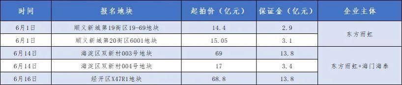 6月16日,北京正在进行本月的第三次土拍,网传的报名表中又出现了东方雨虹的身影,它携手海门海泰报名了经开区X47R地块,这宗地起拍价68.8亿元,仅保证金便高达13.8亿元,出手颇为阔绰。