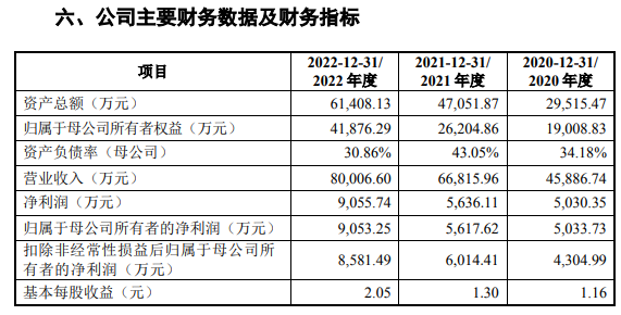 财务方面,2020年-2022年公司实现营业收入分别为4.59亿元、6.68亿元、8.00亿元,实现归母净利润分别为5033.73万元、5617.62万元、9053.25万元,公司经营业绩稳定且持续增长。