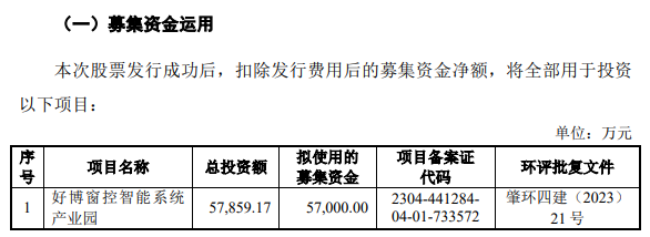 本次IPO,好博窗控拟公开发行不超过1500.00万股,不低于本次公开发行后公司总股本的25.00%。本次股票发行成功后,扣除发行费用后的募集资金净额5.7亿元,将全部用于投资好博窗控智能系统产业园项目。