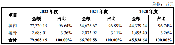 报告期各期,公司境内收入分别为4.43亿元、6.46亿元和7.72亿元,占主营业务收入的比例分别为96.74%、96.89%和96.64%;境外收入分别为1495.40万元、2073.92万元和2688.01万元,占主营业务收入的比例分别为3.26%、3.11%和3.36%。