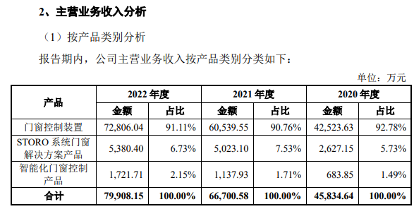 公司主要产品包括门窗控制装置、STORO系统门窗解决方案产品和智能化门窗控制产品三大类。其中,门窗控制装置是公司主营业务收入的主要来源。报告期内,公司门窗控制装置的销售收入分别为4.25亿元、6.05亿元和7.28亿元,占主营业务收入的比例均超过90%。