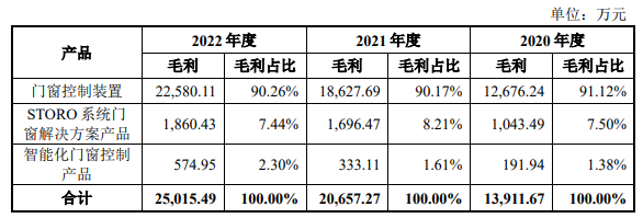 公司的毛利主要来自于门窗控制装置,报告期内,门窗控制装置的毛利率保持基本稳定;STORO系统门窗解决方案产品的附加价值较高,毛利率水平高于门窗控制装置,其中,2021年度受销售政策、原材料价格上涨及出口业务占比下降等因素影响,该产品毛利率下降幅度较大,随着2022年度原材料价格小幅下降,产品毛利率略有回升;智能化门窗控制产品整体收入和毛利的占比较低,随着产品技术的逐渐成熟,毛利率水平呈上升趋势。