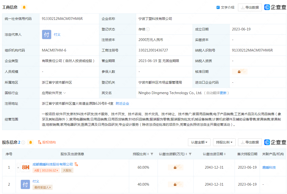 企查查显示,宁波丁盟科技有限公司成立于2023年6月19日,法定代表人为付义,注册资本为2000万元,经营范围包括软件开发;新材料技术研发;技术服务、技术开发、技术咨询、技术交流、技术转让、技术推广;家居用品销售等。该公司由趣睡科技持股60%,付义持股40%。