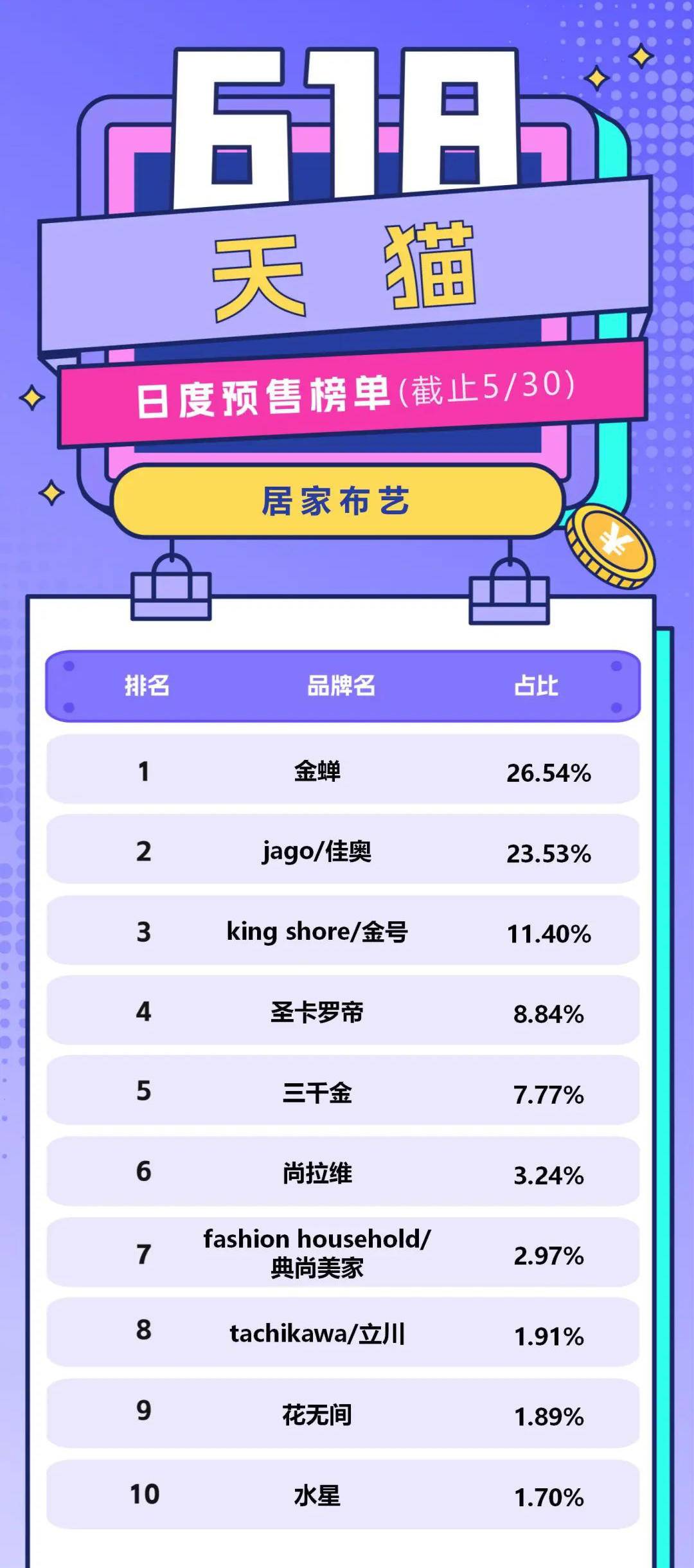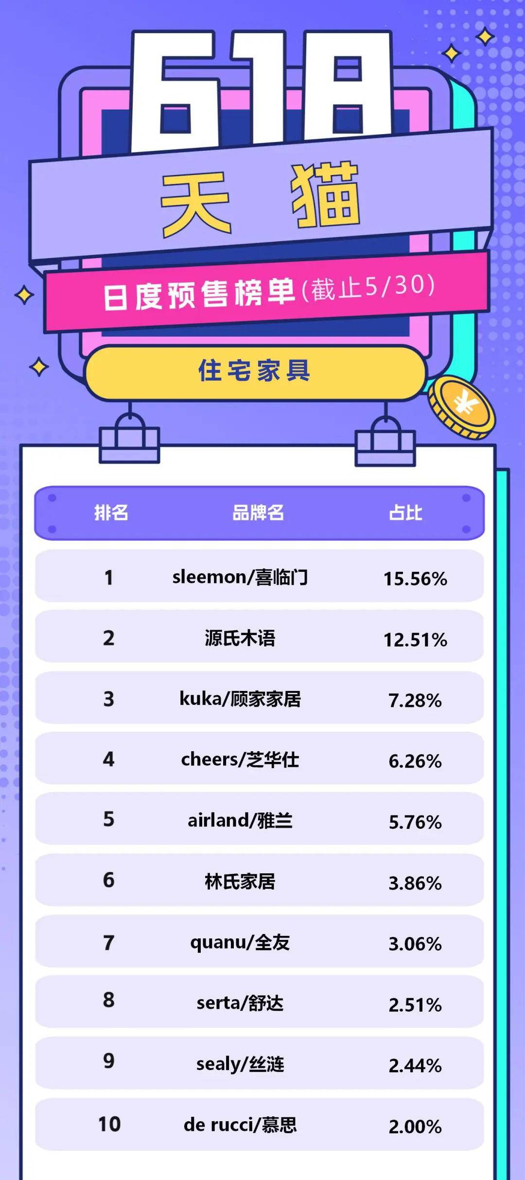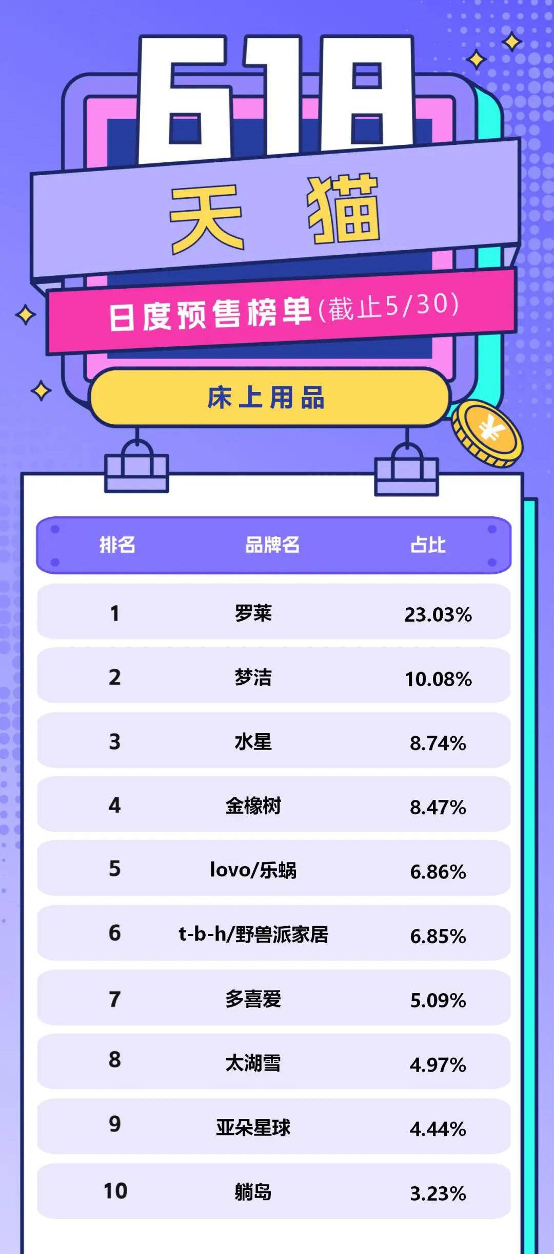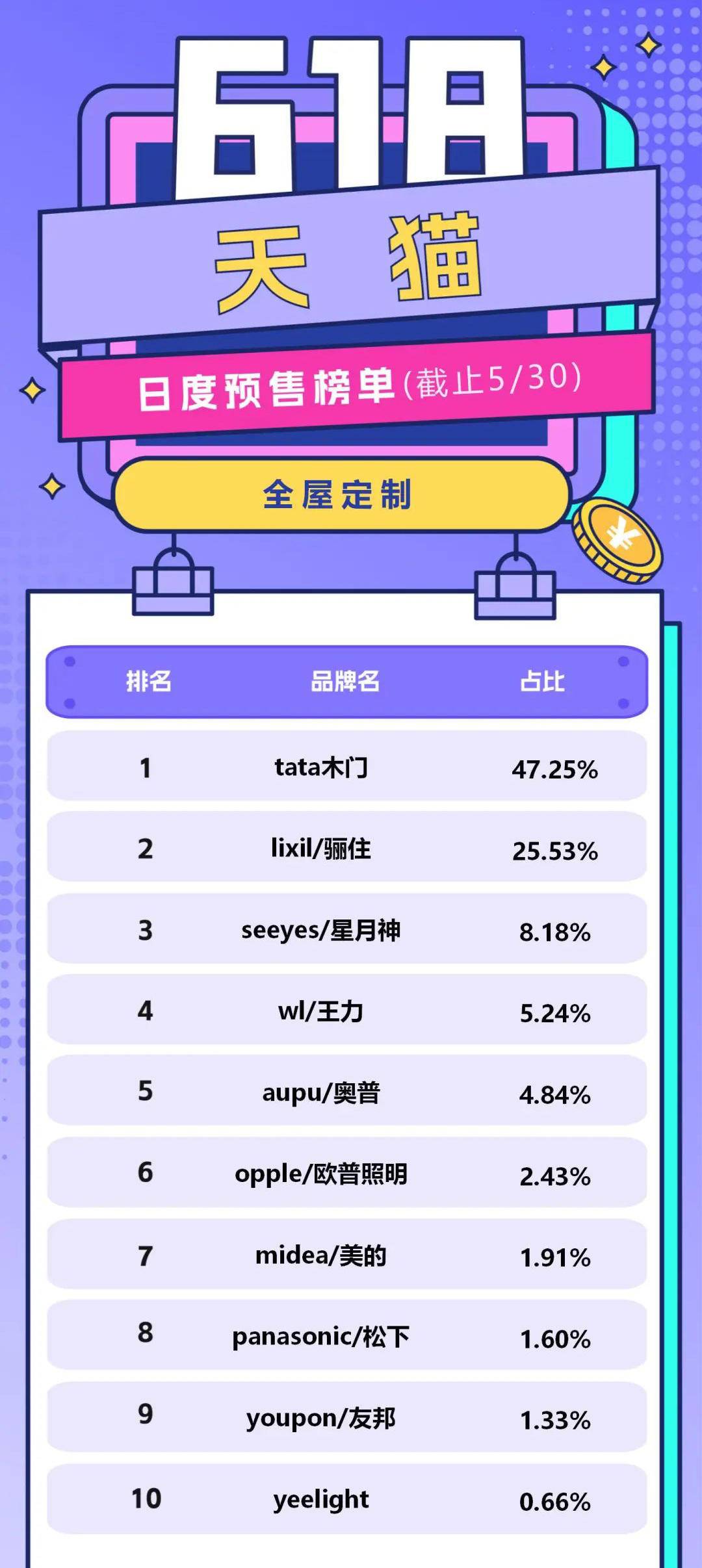 5月31日晚8点,2023淘宝天猫618正式开卖,尾款人也将再次上线。而今年618,除了是“史上投入最大”的一届,可能也是竞争最激烈的一届。下面,77度小编为大家盘点一下家居装饰行业中,天猫平台截至5月30日累计预售额品牌排行。
