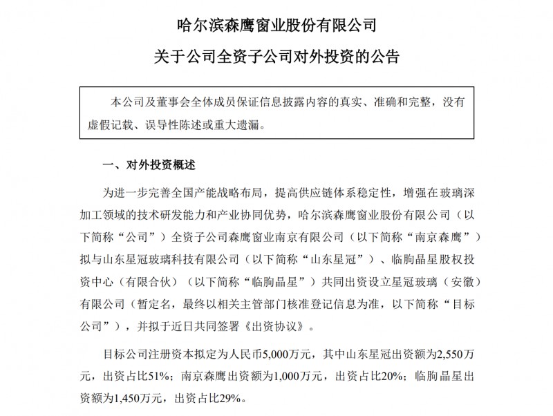 乐居财经 吴文婷 7月18日,森鹰窗业发布公告称,公司全资子公司森鹰窗业南京有限公司(以下简称“南京森鹰”) 拟与山东星冠玻璃科技有限公司(以下简称“山东星冠”)、临朐晶星股权投资中心(有限合伙)(以下简称“临朐晶星”)共同出资设立星冠玻璃(安徽)有限公司(暂定名,最终以相关主管部门核准登记信息为准,以下简称“目标公司”),并拟于近日共同签署《出资协议》。