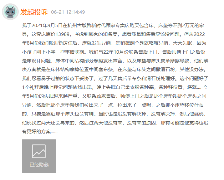 有消费者称顾家的床传出异响,影响睡眠质量。检修师傅认为是床体的设计问题,数次处理仍然无法解决问题。另一名受到异响困扰的消费者则表示床垫维修已经拖了半年,维修人员上门了四次。