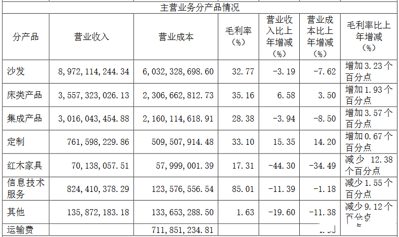 另外,记者从顾家家居2022年年度报告中了解到,沙发和床类产品的营业收入分别为89.72亿和35.57亿,占比均排在前列。