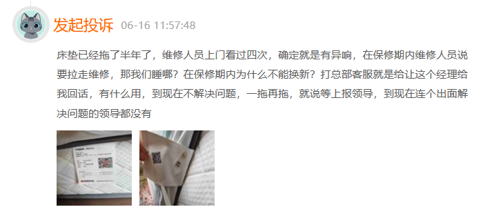直到今年5月7日,他联系售后以后对方安排了师傅上门检修,提出的处理方案是现场拿针线进行缝合。由于师傅无法保证缝合效果,罗先生再次与售后进行了沟通,对方提出让技术人员跟进事件。不过他多次追询售后,都没有获得技术人员的联系。