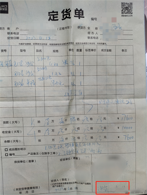 惠州的柳先生在顾家家居门店购买了一套沙发,定货单上约定于5月12日送货。由于未在约定日期送货,柳先生追询后被告知5月20日送货,后续又被推迟到5月22日。结果他在22日当天只收到部分货物,还缺一张沙发。经过官网和400电话投诉,门店回复沙发送货要去到6月9日,换言之交付延期将近一个月。