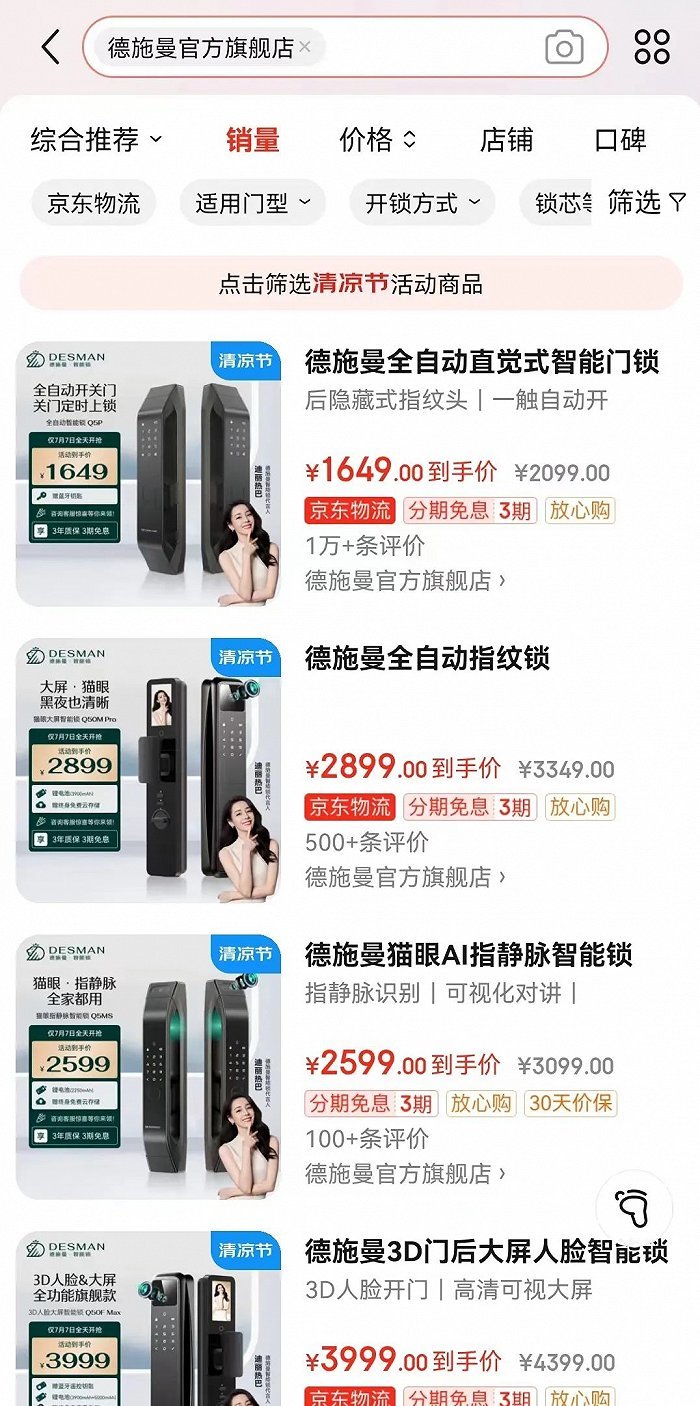 在京东“德施曼官方旗舰店”,销量最好的是德施曼Q5P,这款中端智能锁定价为2099元、活动到手价为1649元。