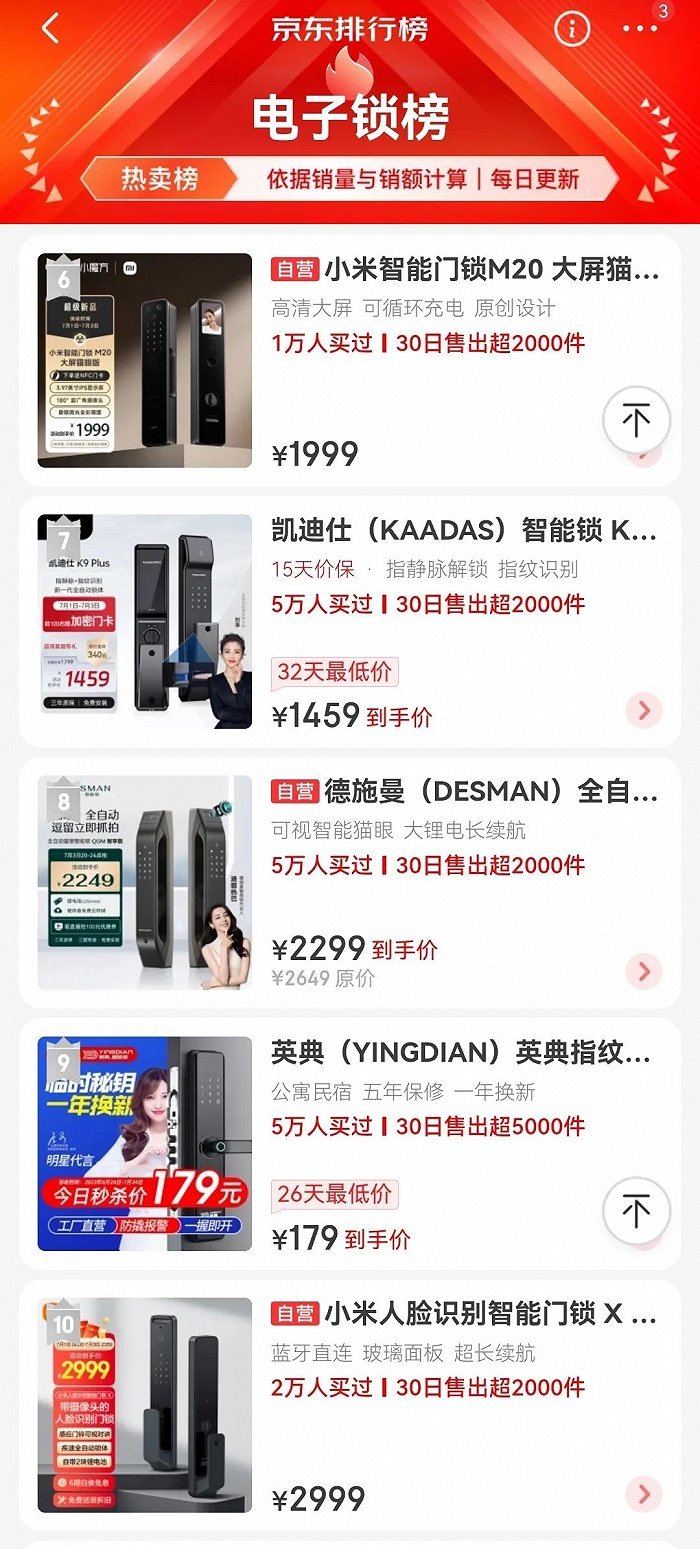 再看销售榜单,以京东电子锁榜为例,TOP 1是价格为799元的小米智能锁,排名前七的智能锁售价均在2000元以下,占据榜单前四位是小米的4款智能锁,TOP 8是德施曼的一款活动到手价为2299元的中端智能锁。