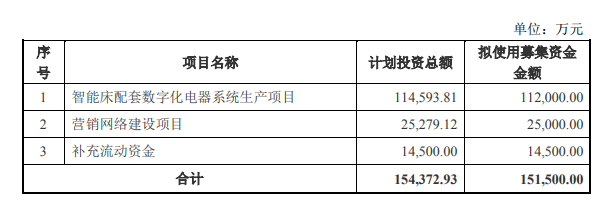 公告显示,投资金额最大的智能床配套数字化电器系统生产项目为新建项目,建设地点为嘉兴市秀洲区王江泾镇。该项目主要产品为智能电动床电器系统(下称“电器系统”)及智能床配套靠背及缝纫外套,其中电器系统包括调节系统、智能控制系统、多功能操作系统及睡眠管理智能系统。该项目建成后,可形成调节系统产能800万套/年,控制系统产能400万套/年,操作系统产能400万套/年,睡眠管理智能系统100万套/年,缝纫外套100万张/年,智能床配套靠背产能50万张/年的生产规模。