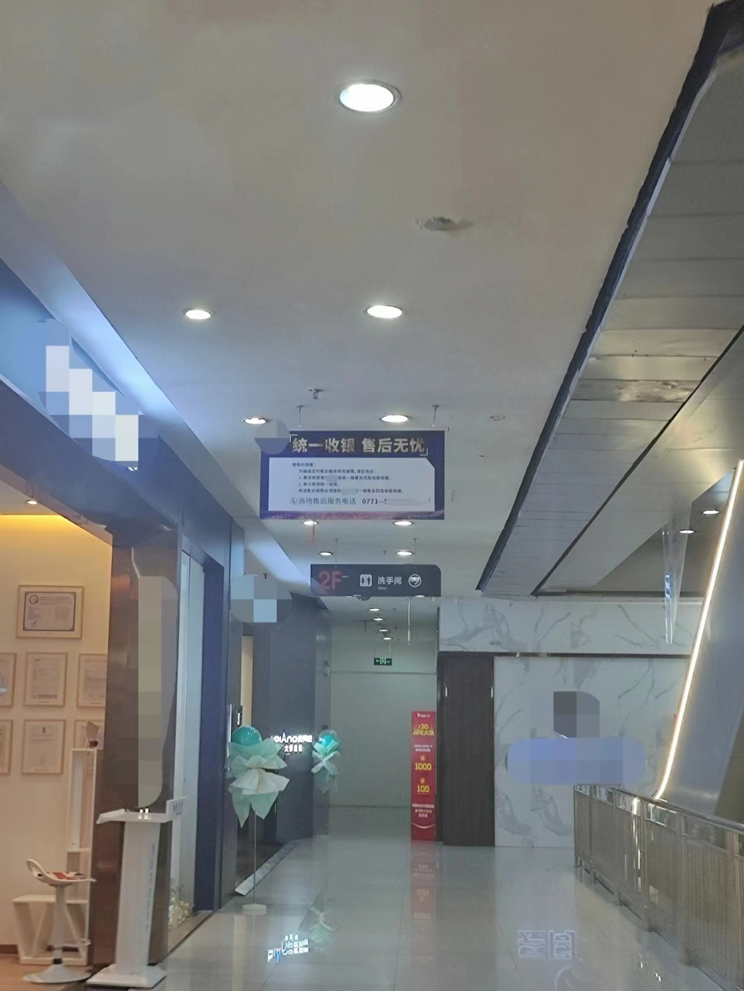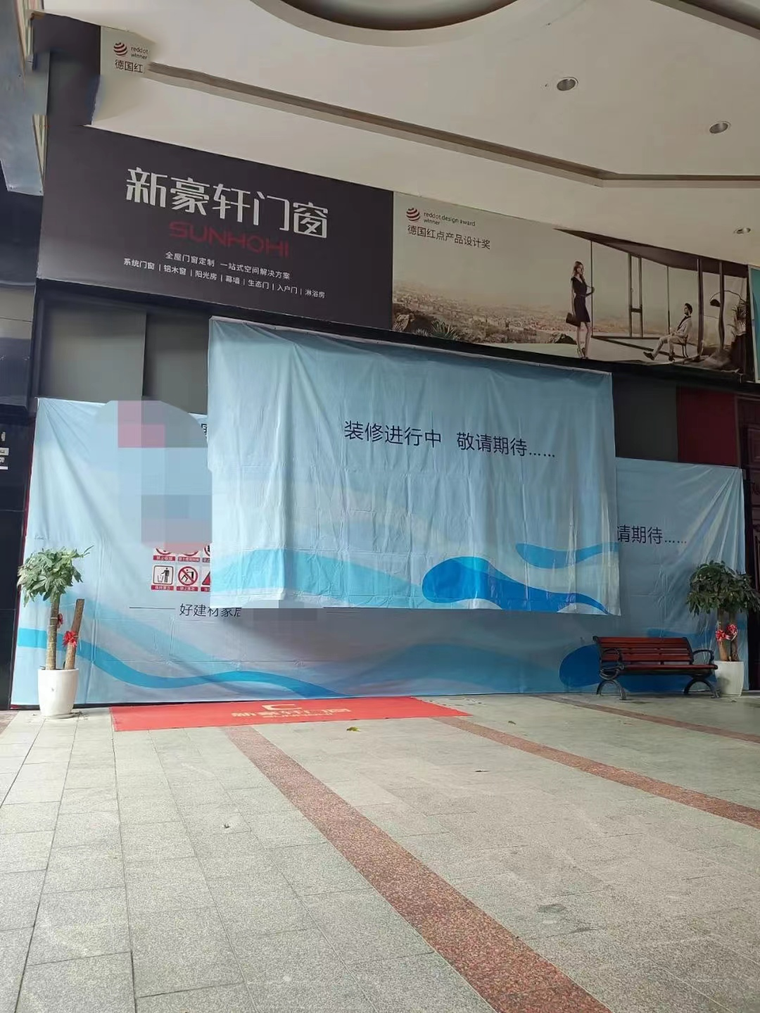 8月10日,记者在该家居建材市场内看到,很多公共走道上都挂有“统一收银,售后无忧”的提示海报,提醒顾客参与商场统一收银。翻开“新豪轩门窗”的临时围挡布,也看到了蓝色提示牌。