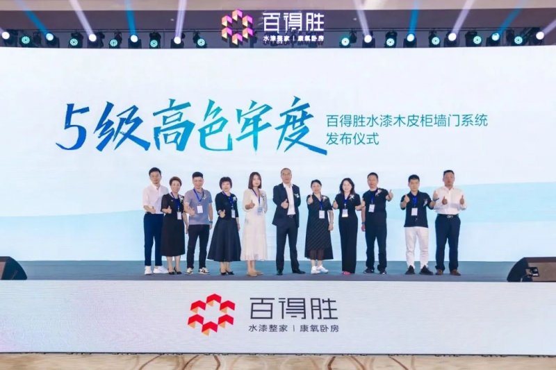 大会现场,百得胜5级高色牢度水漆木皮柜墙门系统的重磅发布,表现了百得胜始终深耕水漆战略,持续不断地探索创新,通过掌握水漆核心科技,全面构筑自己的核心竞争力。