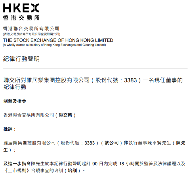 声明最后,港交所对陈卓贤进行批评,并在3个月时间内完成18小时关于监管及法律议题以及《上市规则》合规事宜的培训。