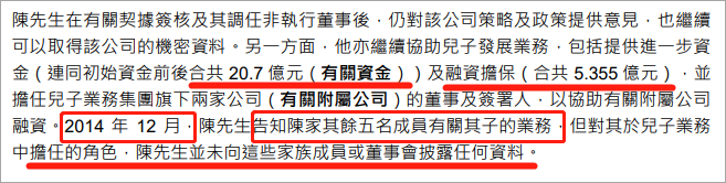 根据港交所的声明,陈卓贤为其儿子提供资金合计20.7亿元,融资担保5.355亿元。他还担任儿子业务集团旗下2家公司的董事及签署人,以协助这两家公司进行融资。