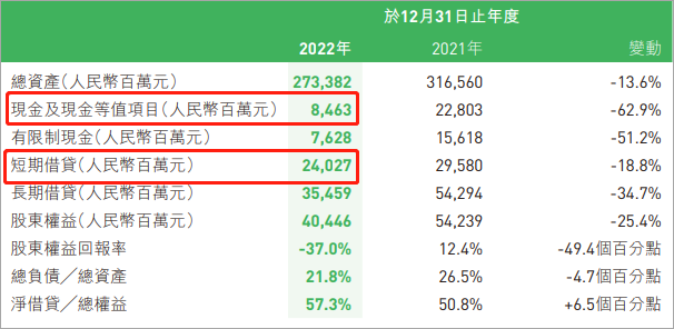 截至2022年末,雅居乐的现金资产只有84.63亿,而短期借贷(须于一年内偿还的债务)则多达240.27亿元。